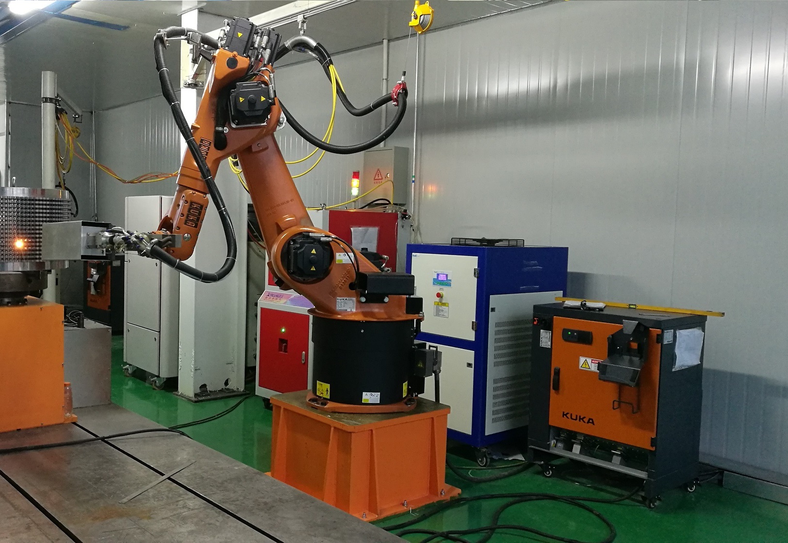 选用KUKA KR60HA机器人,搭载激光工作头进行激光加工工件,配备通讯接口、数字/模拟信号接口方便与激光控制系统连接通讯并进行深度集成,并可以对接DCAM软件,控制IRC5升级可实现对二维变位实现六轴联动功能。